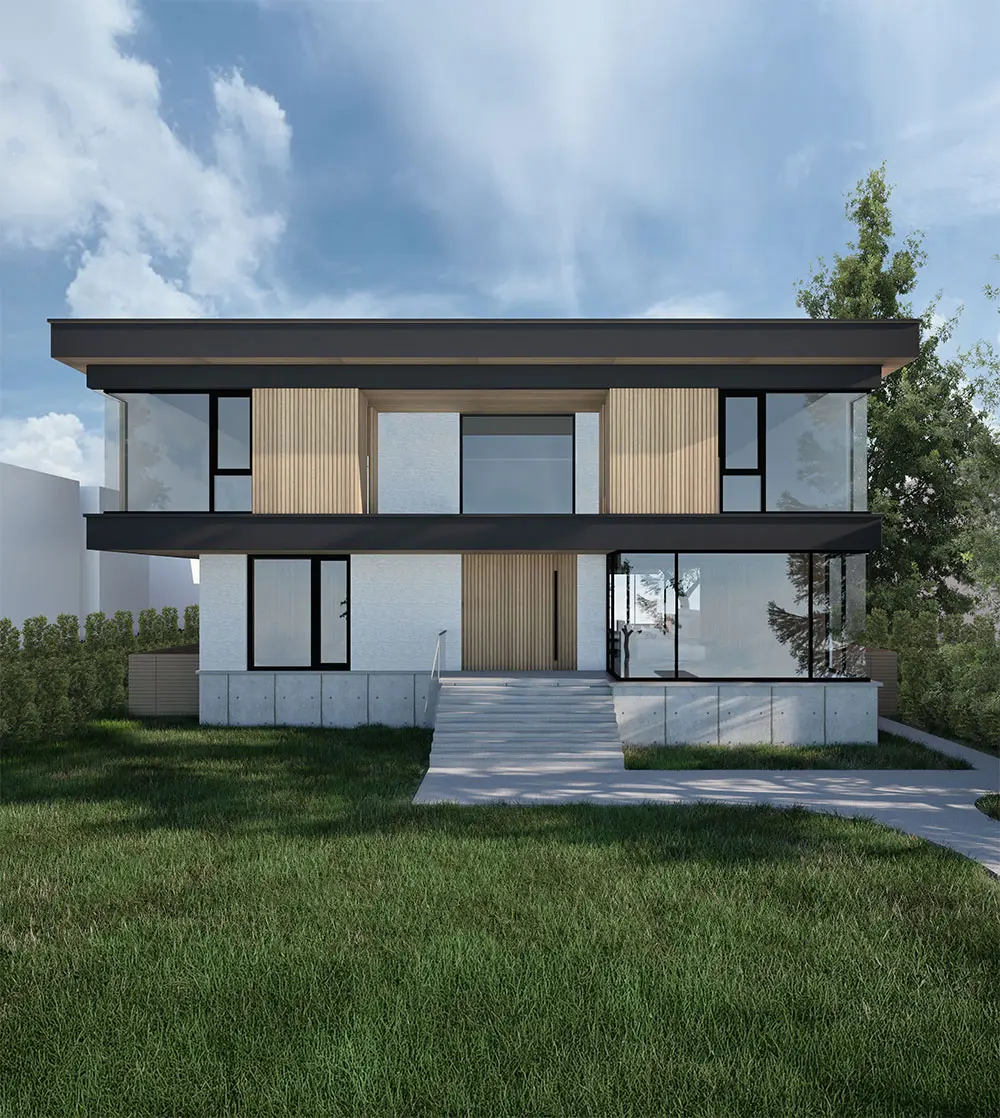 The facade is anchored by Schüco AWS 90 BS.SI windows, known for their outstanding thermal properties and clean visual lines. Floor-to-ceiling windows maximize light transmission and enhance the interior connection to the landscape, while delivering the insulation performance required by Vancouver’s increasingly demanding energy standards. Several of these units were paired with motorized hopper systems, allowing discreet operability without compromising airtightness or the simplicity of the frame.